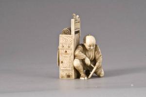 Okimono raffigurante un artigiano alle prese con l'intaglio di una pipa (kiseru). Con il fianco destro si appoggia ad un mobiletto in legno trasportabile a mo' di zaino grazie a due fasce per le spalle: l'arredo ha vari cassetti, mentre in alto sono raccolti in una fascia alcuni pezzi di bambù ancora grezzi; due pipe già terminate sono sistemate sulla rastrelliera, posizionate sulla parte superiore del mobiletto.