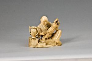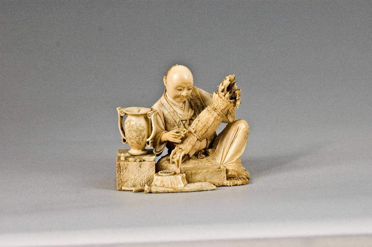Okimono di notevoli dimensioni, composto come assemblaggio di più pezzi di avorio, raffigurante un uomo seduto intento a raccogliere un mazzo di fiori in una fascina; la composizione floreale sarà probabilmente accolta nel vaso biansato che sta posato su un basso mobiletto a due cassetti sistemato alla destra dell'uomo. Ai piedi del personaggio si vede una scatola contenente gli attrezzi da lavoro; all'obi tiene appesa, grazie ad un netsuke, una borsa da tabacco (tabako-ire) con tanto di pipa (kiseru) nell'astuccio (kiseruzutsu).
