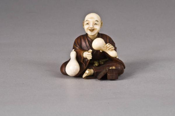 Netsuke raffigurante un artigiano seduto a gambe incrociate davanti al quale sta posata una scatola a sezione quadrata, impegnato nella lavorazione di una zucca (hyotan) secca per farne un contenitore da liquido; un altro ortaggio simile è posato sul suo ginocchio destro. I due fori dell'himotoshi sono ubicati sul lato inferiore della composizione.