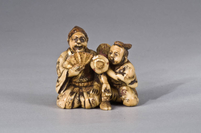 Il netsuke, con i fori dell'himotoshi posti al di sotto della composizione, raffigura due danzatori di Manzai seduti sulle proprie ginocchia. Il personaggio sulla sinistra, con in testa un copricapo di tipo eboshi, tiene nella sua mano destra un ventaglio aperto; quello sulla destra, invece, sorregge con la mano sinistra il tamburo posato sulla spalla e la parte superiore del braccio. Molti dettagli della composizione sono laccati, dorati e dipinti, oltre che in nero, anche in rosso, per evidenziare le incisioni, soprattutto nei decori degli abiti di entrambi i personaggi.