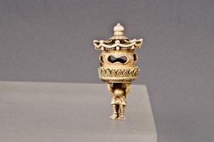Okimono raffigurante una figura maschile seminuda stante, con le mani sollevate a sorreggere una grande lampada.