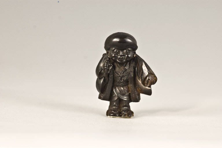 Netsuke in corno raffigurante Fukusuke, vestito di un abito decorato sul retro con un fregio a meandro di greca. Con la mano destra trattiene un laccio al quale è legata una maschera di Okame, portata sulle spalle. I due fori dell'himotoshi si trovano sul retro, all'altezza del bacino, leggermente spostati verso il fianco sinistro della figura.