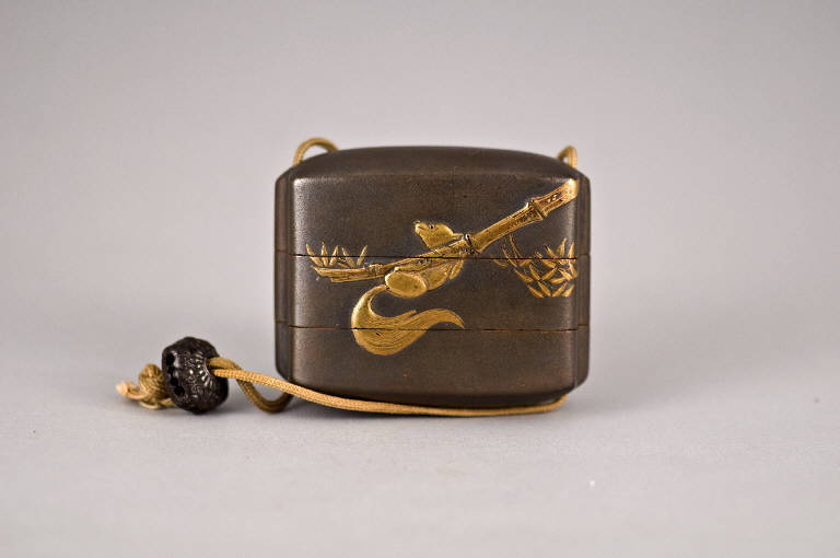 L'ojime, in legno, ha forma schiacciata ed è decorato a rilievo con motivi floreali.