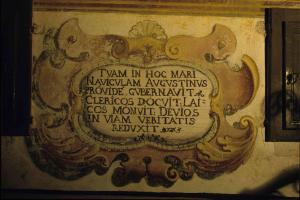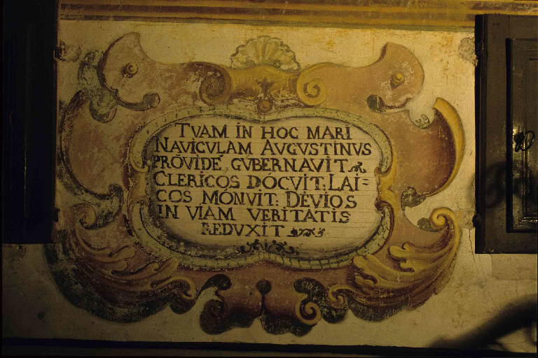 Cartella dipinta con iscrizione sulla specchiatura centrale e decorazione a volute e foglie d'acanto