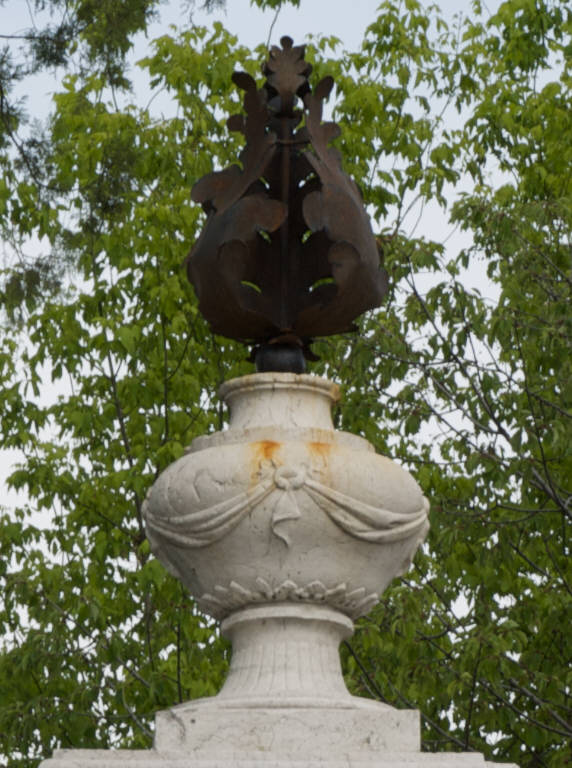 Vaso decorato sul corpo dal rilievo di un giro di foglie aperte e da un nastro annodato, chiuso alla sommità da tre foglie d'acanto in ferro battuto unite alla cima da altre due foglie più piccole.