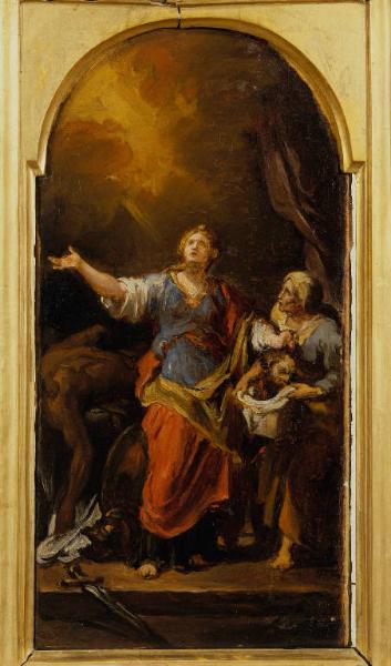 - NOTIZIE STORICO CRITICHE Si tratta del bozzetto di una pala d'altare dipinta nel 1828 per la cappella del Rosario nella chiesa di San Martino ad Alzano Lombardo, con la mediazione di Guglielmo Lochis: rappresenta la prefigurazione di Maria Vergine (Madonna): Giuditta vincitrice su Oloferne come la Madonna vincitrice sul Demonio. Il bozzetto è citato in una lettera del Camuccini al Lochis del 28 gennaio 1826 in cui il pittore informa il collezionista di aver terminato il cartone per la pala e che da Roma gli avrebbe spedito successivamente il bozzetto per ringraziarlo del suo interessamento. Il 24 luglio 1827 Camuccini conferma la promessa del "disegno". Il 27 febbraio 1828 Camuccini annuncia a Lochis che insieme alla pala finita avrebbe trovato anche il bozzetto. La pala fu consegnata ad Alzano per la Pasqua del 1828. G. Brambilla Ranise riporta come data di acquisizione alla collezione Lochis il 1826.