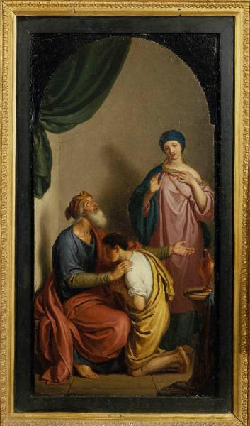 - NOTIZIE STORICO CRITICHE Si tratta del bozzetto di una pala d'altare con una prefigurazione di Maria Vergine: Rebecca auspice del passaggio della primogenitura da Esaù a Giacobbe, come Maria auspice del passaggio dall'antica alla nuova legge. La pala fu eseguita nel 1836 da Giuseppe Diotti per la Cappella del Rosario nella Basilica di Alzano Lombardo. L'opera fu donata da Diotti a Guglielmo Lochis nel dicembre del 1835 (Mangili, 1995, p. 482)