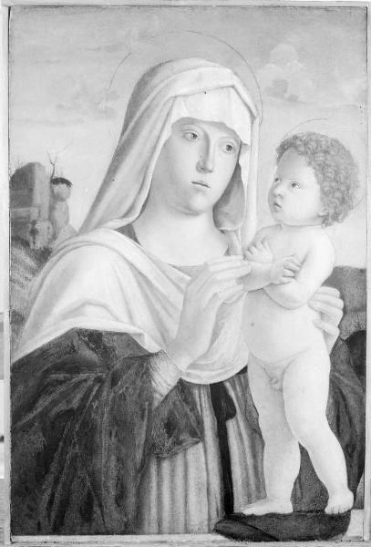 - NOTIZIE STORICO CRITICHE L'opera è citata da G. Morelli nel 1864 che scrive: "Opera vera dell'autore, ma non delle belle - alquanto ripassata - Val. 45". Il supporto è una tavola unica realizzata in legno di noce. La cornice novecentesca è in legno modanato e dorato. L'opera fa parte di una serie di Madonne tratte dallo stesso cartone