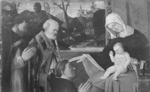 - NOTIZIE STORICO CRITICHE Opera sacra a destinazione privata. In precedenza San Pietro Martire e San Nicola di Bari non erano stati identificati. I Santi sul piviale del San Nicola sono Paolo, Caterina d'Alessandria e Andrea. La montagna al centro è del gruppo delle Dolomiti. Il supporto è costituito da una tavola unica. Il gruppo della Vergine con il Bambino riprende un modello di Giovanni Bellini utilizzato anche da molti altri seguaci del maestro in composizioni anche a più figure.