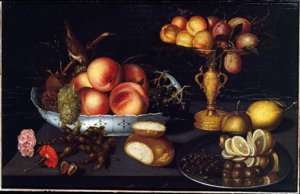 - NOTIZIE STORICO CRITICHE Il depinto esiste una replica, quasi sovrapponibile ma con varianti in colelzione privata (J. Stoppa in "Fasto e rigore", 2000). Forse la fruttiera è un manufatto Ming (Il Seicento a Bergamo).