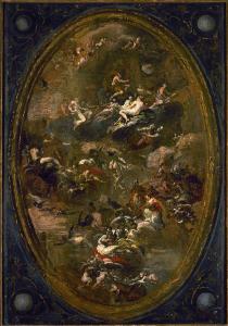 - NOTIZIE STORICO CRITICHE Bozzetto per la decorazione di una volta, l'opera può essere accostata all'ambiente napoletano di Francesco Solimena e, secondo l'ipotesi di F. Rossi (in "La raccolta Maria Volpi ..., 1996), dovrebbe appartenere a uno dei suoi allievi, Domenico Mondo o Piero Bardellino. L'opera, facente parte del legato della nobildonna Sandra Maria Volpi Bassani D'Amico, deceduta nel 1989, fu acquisita dall'Accademia Carrara nel 1996.