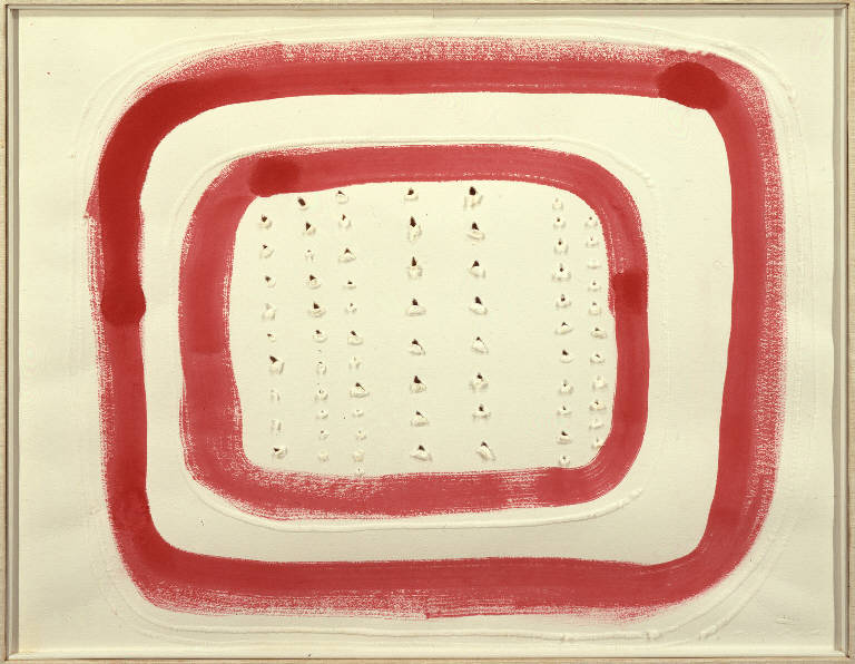 - NOTIZIE STORICO CRITICHE Il dipinto fa parte di un gruppo di opere di arte moderna donate all'Accademia Carrara dal critico d'arte Davide Cugini in memoria del figlio Aldo. Tutta la serie dei "Concetti spaziali" di Lucio Fontana, in cui il segno-gesto buca tele, carte e carte telate, deriva in sostanza dalle esperienze dell'artista come scultore e ha inizio nel '49: l'oggetto artistico non è più "cosa" bensì "luogo" plastico percepito in un determinato tempo. Il bucare la tela è il gesto fondamentale dell'arte spaziale che con questo gesto di rottura della superficie pittorica scardina la bidimensionalità della tela e permette al vuoto al di là della tela di entrare nella composizione. I buchi non sono che i fori della serratura da cui l'arte guarda la vita vera, l'unica che valga la pena di vivere. Il gesto dell'artista non è definibile come pittorico o scultoreo, ma si propone come atto di conoscenza, ed è per questo che tali opere vengono definite "Concetti spaziali". Nelle opere di Fontana di questo periodo i buchi o i tagli non hanno un'organizzazione casuale ma sempre molto calibrata, in rapporto a una riflessione sull'architettura o sull'organizzazione presente in altre opere, come ad esempio in quelle di Mondrian. A questa ricerca di Fontana si collegano numerosi disegni che non sono mai però progetto per un'opera precisa, ma documentano quanto lavoro è necessario per arrivare all'assoluto, al gesto primario del "taglio" o del "foro". L'opera in oggetto, caratterizzata da una doppia cornice che incornicia teorie verticali di fori, si collega alla serie detta "Teatrini", prodotta dal 1964 al 1966, in cui il contrasto tra le sagome di contorno in legno laccato e i fondali di tela con buchi sembra tendere alla terza dimensione.