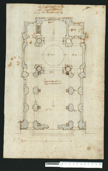 - NOTIZIE STORICO CRITICHE Nell'"Indice" del tomo nel quale era rilegato il disegno viene definito: "D.a della Chiesa dei Napoletani in Roma" (leggi: "Pianta della Chiesa dei Napoletani in Roma").\nSi tratta di una copia anonima di un progetto di Ottaviano Mascherino per la nuova chiesa dello Spirito Santo dei Napoletani, per la quale sono noti altri disegni mascheriniani: tre nella collezione dell'Accademia di S. Luca (schede di catalogo n. 2357, 2358, 2359, datati al 1584), due in Milano, Collezione Sardini Martinelli, inv. 4,40 e 4,85).\nI sei disegni possono essere considerati progetti "astratti", sottoposti alla confraternita dei Napoletani affinché potesse operare una scelta; scelta che poi cadrà su un altro disegno più tradizionale. Il presente disegno (in parte confrontabile con il 2358 dell'Accademia di S. Luca) mostra un impianto longitudinale, con navata centrale a tre campate con cappelle comunicanti e ritmata da colonne libere addossate a pilastri, con transetto cupolato e coro rettilineo. Una soluzione questa che anticipa il progetto di Mascherino per il S. Salvatore in Lauro (Salerno, Spezzaferro, Tafuri 1973, p. 393). La scritta posta al centro della navata testimonia il legame del disegno con la chiesa dei Napoletani, infatti è simile a quella posta al margine del disegno 2357 dell'Accademia di S. Luca: "A di 15 di maggio 1584 fu fatto il presente disegno p. la chiesa de Napoletani di Strada Giulia", la data del disegno di S. Luca è invece 26 maggio.