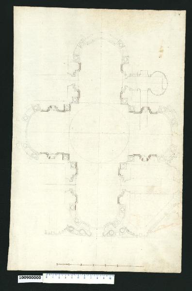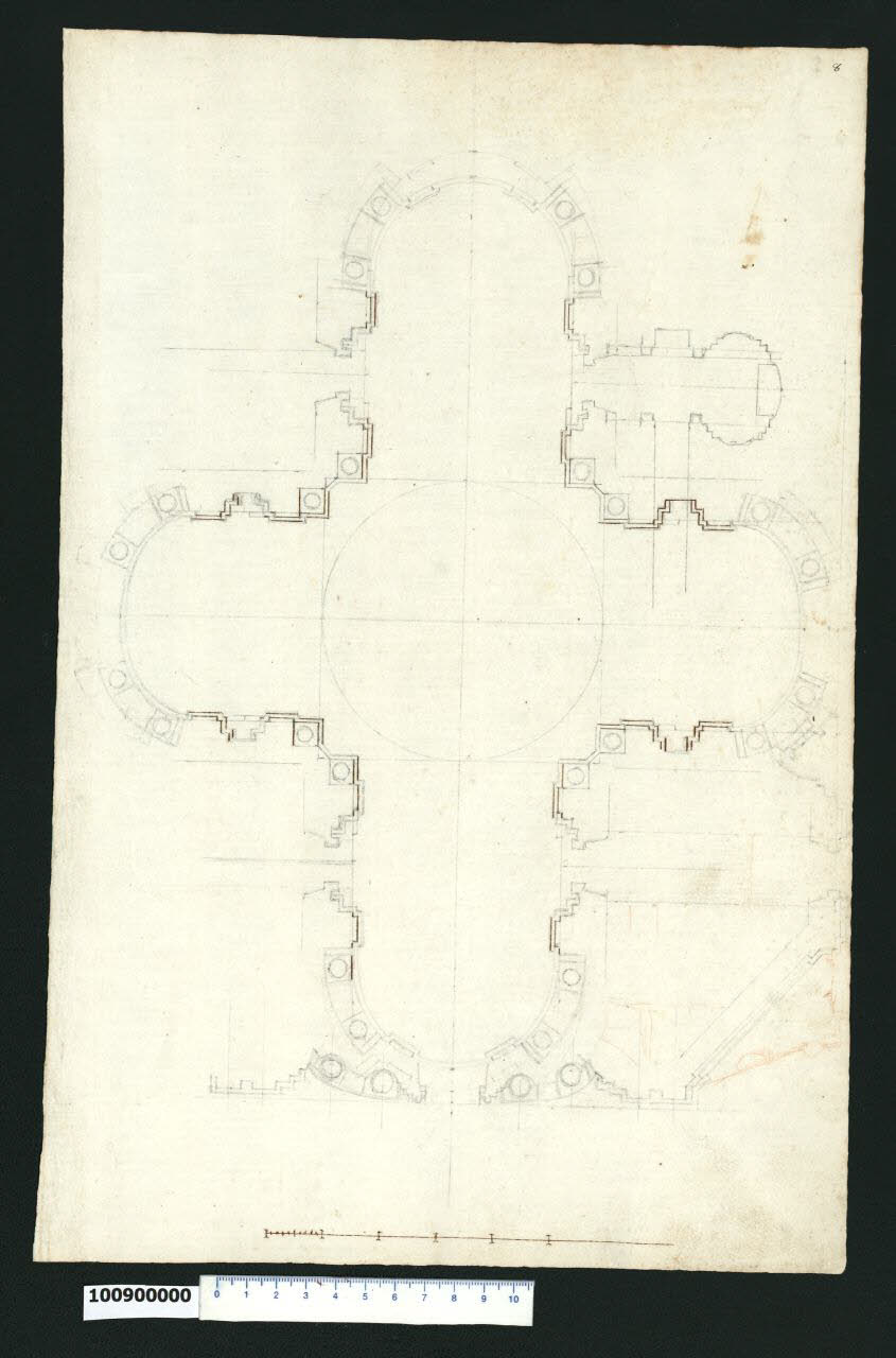 - NOTIZIE STORICO CRITICHE Nell'"Indice" del tomo nel quale era rilegato il disegno viene definito: "D.a di Chiesa" (leggi: "Pianta di Chiesa").\nIl disegno si riferisce alla chiesa dei SS. Luca e Martina a Roma, progettata da Pietro da Cortona e costruita a partire dal 1635. Ubicata presso l'arco di Settimio Severo, la chiesa di S. Martina era stata donata da Sisto V nel 1588 all'Accademia di S. Luca i cui membri da quel momento iniziarono a riunirsi in due stanze adiacenti il prospetto del piccolo edificio ad aula (cfr. Milano, Collezione Sardini Martinelli inv. 1,27a). Ben presto si manifestò la necessità di ricostruire l'edificio religioso, come testimoniano alcuni disegni di Ottaviano Mascherino. Accantonata per alcuni anni, l'idea viene ripresa, secondo Karl Noehles (1970), tra il 1623 e il 1634, quando Pietro da Cortona elabora, di propria iniziativa, un progetto di chiesa a pianta centrale.\nNel luglio 1634 Pietro ottiene dall'Accademia l'autorizzazione a sistemare "a suo gusto" la cappella sotterranea. Durante gli scavi si rinvengono i corpi dei martiri Martina, Epifanio e Concordio, da questo momento il cardinale protettore Francesco Barberini e papa Urbano VIII decidono di elargire fondi per la ricostruzione della chiesa, il cui nuovo progetto dovette essere elaborato tra la fine del 1634 e l'inizio del 1635. A breve vennero edificati l'abside e l'altare maggiore, mentre sono documentati lavori nella cripta negli anni Quaranta.\nNel 1648 con il ritorno a Roma del cardinale Francesco Barberini (fuggito in Francia nel gennaio 1646), e nella speranza di nuovi contributi economici per completare la chiesa, Pietro da Cortona elabora un piano di ristrutturazione dell'area complessiva della chiesa superiore, riprendendo l'idea di sviluppare liberamente l'edificio su almeno tre lati. I progetti di tale ristrutturazione sono tramandati in due piante conservate in Milano, Collezione Sardini Martinelli inv. 1,3 e 1,9.\nIl presente disegno, tracciato completamente a matita, presenta un "pentimento" che riduce decisamente la smussatura della facciata e che può indurre a credere che si tratti di un progetto originale di Pietro da Cortona. Secondo Noehles (1970, p. 106, nota 231) ciò è da escludere in base alle tecniche e al carattere del disegno, che corrispondono a quelli delle copie di Martinelli tratte dagli originali. Il pentimento andrebbe quindi inteso piuttosto come un errore del disegnatore inesperto che del resto lasciò anche il foglio incompiuto e rifece da capo il disegno.\nTutti i disegni della Collezione Sardini Martinelli sono stati ritenuti da Noehles copie di originali di Pietro da Cortona, che Domenico Martinelli avrebbe eseguito all'Accademia di S. Luca verso la fine del Seicento (durante il soggiorno romano del 1678-1690).