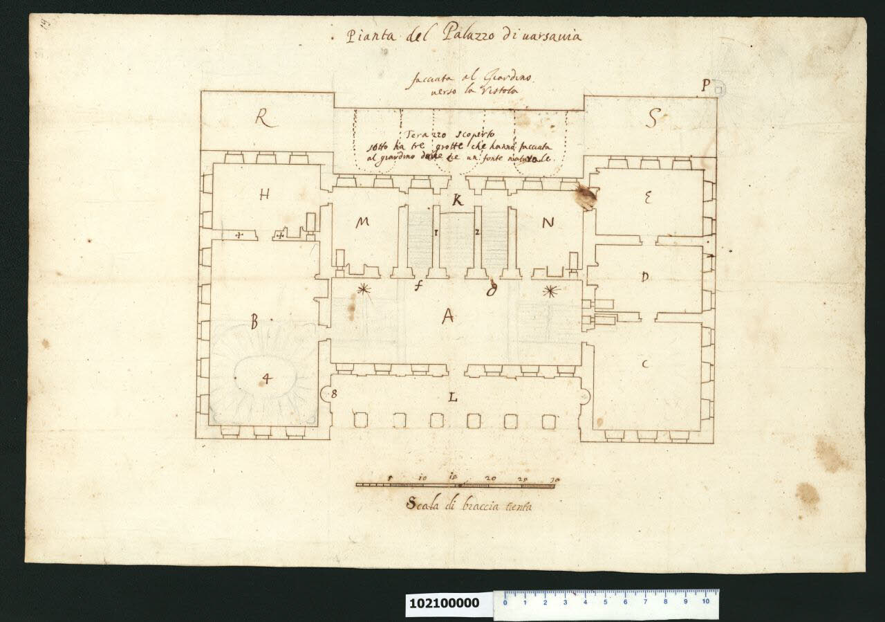 - NOTIZIE STORICO CRITICHE Nell'"Indice" del tomo nel quale era rilegato il disegno viene definito: "D.a d'un Palazzo in Varsavia" (leggi: "Pianta d'un Palazzo in Varsavia").\nSi tratta della pianta del piano terra del palazzo di Stanislaw Koniecpolski, ministro degli affari militari del re Ladislao IV. Fu eretto negli anni 1643-45 su progetto di Costante Tencalla sul terrazzo degradante verso il fiume Vistola, lungo la strada di rappresentanza che dalla città vecchia portava al Castello di Ujazdow, la seconda residenza del re.\nLa pianta delineata da Giovanni Battista Gisleni, sembrerebbe uno studio per valutare il posizionamento dello scalone monumentale, e mostra l'edificio come un blocco autonomo, con una terrazza belvedere dalla parte della Vistola, un portico a sette archi dalla parte della strada, con evidenti sporgenze ai limiti delle due facciate principali, soluzione questa apparsa per la prima volta in Polonia.