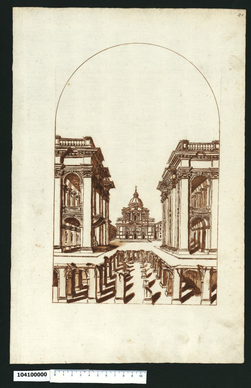 - NOTIZIE STORICO CRITICHE Nell'"Indice" del tomo nel quale era rilegato il disegno viene definito: "Prospetto con sotterranei".\nIl disegno era stato identificato da Portoghesi (1966, 1973) come un progetto per la sistemazione dell'area antistante la chiesa del Gesù. Il foglio mostra al di sopra di una specie di sostruzione parzialmente in rovina, due palazzi ispirati a quelli capitolini di Michelangelo e, sullo sfondo, la chiesa del Gesù.\nSuccessivamente Krautheimer (1987, pp. 124-125) ha ipotizzato che possa trattarsi della scenografia per una rappresentazione sacra svoltasi nella stessa chiesa, ipotesi che potrebbe essere confermata anche dalla presenza del baldacchino papale inserito in una delle arcate della loggia a sinistra. Lo stesso studioso ha attribuito l'ideazione della composizione a Pietro da Cortona e il disegno alla sua cerchia. Secondo Cerutti-Villani (2002, p. 310) tale attribuzione è "avvalorata dal tratto estraneo al ductus cortoniano, dall'evidente imprecisione con la quale sono resi taluni particolari architettonici, dal trattamento sommario delle ombre, dalla stessa incongruenza costruttiva della composizione (si noti il disassamento tra i sostegni della sostruzione ed i pilastri superiori): tali, nel loro complesso da differenziare il disegno dagli altri elaborati cortoniani".