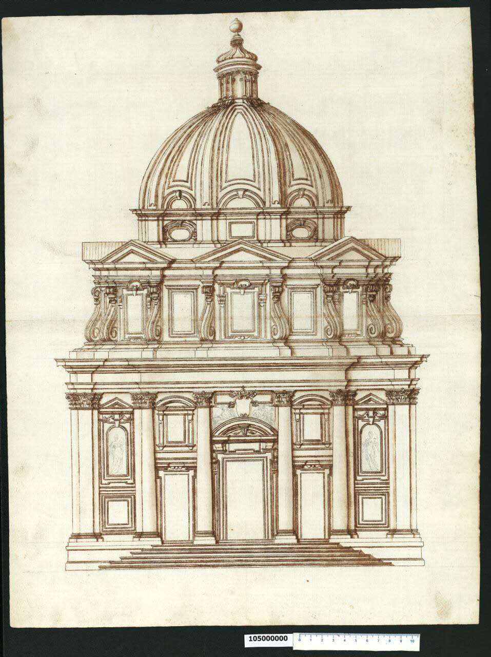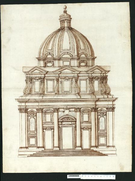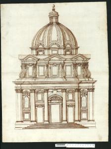 - NOTIZIE STORICO CRITICHE Nell'"Indice" del tomo nel quale era rilegato il disegno viene definito: "Facciata di Chiesa con Cupola".\nIl disegno si riferisce alla chiesa dei SS. Luca e Martina a Roma, progettata da Pietro da Cortona e costruita a partire dal 1635. Ubicata presso l'arco di Settimio Severo, la chiesa di S. Martina era stata donata da Sisto V nel 1588 all'Accademia di S. Luca i cui membri da quel momento iniziarono a riunirsi in due stanze adiacenti il prospetto del piccolo edificio ad aula (cfr. Milano, Collezione Sardini Martinelli inv. 1,27a). Ben presto si manifestò la necessità di ricostruire l'edificio religioso, come testimoniano alcuni disegni di Ottaviano Mascherino. Accantonata per alcuni anni, l'idea viene ripresa, secondo Karl Noehles (1970), tra il 1623 e il 1634, quando Pietro da Cortona elabora, di propria iniziativa, un progetto di chiesa a pianta centrale.\nPer quanto riguarda la genesi progettuale i disegni conosciuti, su cui gli studiosi discutono criticamente, sono quattro: una pianta e un prospetto conservati in Milano, Collezione Sardini Martinelli inv. 1,1; 1,50 (cui va aggiunta anche la sezione prospettica inv. 1.40 poco considerato nel dibattito critico, forse perché copia di quella autografa di Monaco); un disegno conservato a Oxford, che costituisce una variante della pianta di Milano (inv. 1,1); una sezione prospettica conservata a Monaco, unico elaborato autografo del Cortona.\nTradizionalmente questi disegni sono stati riferiti ai SS. Luca e Martina e considerati come appartenenti alle prime fasi del progetto definitivo del 1634-35, e per essi gli studiosi hanno proposto diverse datazioni: Keller (1961) e Hubala (1962) li datano al 1634, mentre Noehles (1970 p. 61, 1997 p. 456, 1999 pp. 441-442) li anticipa ai primi anni Venti del XVII secolo. Egli sostiene che i disegni, essendo databili su basi stilistiche al 1621-23, riguardano una fase antecedente al progetto del 1634 e si riferirebbero a una proposta per il mausoleo dei Ludovisi, il cui stemma sarebbe leggibile nella sezione prospettica di Monaco. Diversa è l'opinione di Merz (1998 p. 232 e ss.) che riesaminata criticamente l'intera questione, ha messo tali disegni in rapporto ad un progetto per un mausoleo dinastico dei Pamphilj o presso la chiesa Nuova (1644-52), oppure, supposizione che lo studioso tedesco ritiene più probabile, per S. Agnese in Agone.\nTutti i disegni della Collezione Sardini Martinelli sono stati ritenuti da Noehles copie di originali di Pietro da Cortona, che Domenico Martinelli avrebbe eseguito all'Accademia di S. Luca verso la fine del Seicento (durante il soggiorno romano del 1678-1690). Tale attribuzione è stata messa in dubbio da Lorenz (1991 p. 320). A suo avviso sono poche le corrispondenze con la tecnica disegnativa di altri sicuri disegni di Martinelli, per confermargli questi elaborati, quindi non ritiene di condividere in tutti i casi le opinioni di Noehles (1970, nota 115), secondo cui tutti i disegni di questo tomo correlati a Cortona, sono da vedere come disegni di Martinelli.\nIl presente disegno si riferisce ad una pianta simile, ma non identica, a quella raffigurata in Milano, Collezione Sardini Martinelli inv. 1,1, che consiste in un cerchio intersecato da un quadrato. La facciata della chiesa risulta quindi dalla configurazione del suo spazio interno: ai segmenti del cerchio esterno corrispondono dei risalti convessi che avanzano oltre le sporgenze ad angolo del quadrato. I tre prospetti (il quarto manca perché annesso agli ambienti dell'accademia) presentano la medesima struttura: lesene giganti nelle campate esterne a parete piana, colonne giganti addossate alle convessità delle zone mediane.