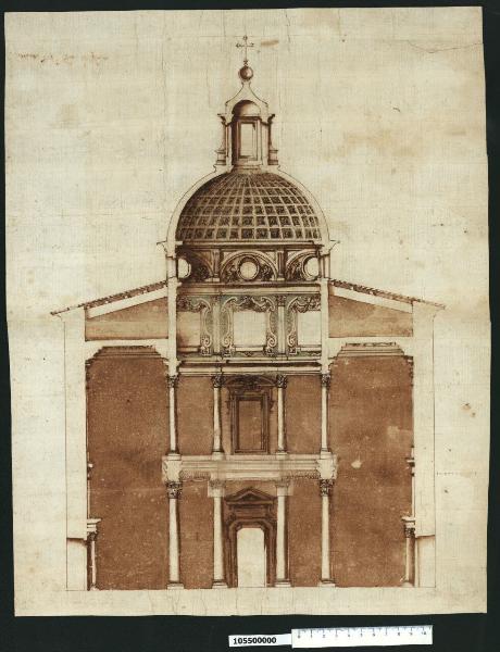 - NOTIZIE STORICO CRITICHE Nell'"Indice" del tomo nel quale era rilegato il disegno viene definito: "Spaccato di S. Gio. in fonte".\nAnnesso alla basilica di S. Giovanni in Laterano, Costantino fece costruire anche un battistero coperto da un tetto di legno e pianta centrale, circolare o ottagonale, poi ristrutturato o completamente rifatto al tempo di Sisto III (432-440), il quale adottò il modello a doppio involucro con vano centrale e cupola leggera (forse con struttura di tubi fittili) sorretta da un doppio ordine architravato di colonne libere, il deambulatorio, oltre il quale furono annessi altri ambienti, tra cui un vestibolo a terminazioni absidale. Nel 1575 viene sottolineato, con un nuovo portale, l'ingresso secondario, opposto al nartece di Sisto III e rivolto verso piazza S. Giovanni, posta a termine del nuovo rettifilo (via Merulana-S.Giovanni in Laterano-S.M. Maggiore) creato che Gregorio XIII (1572-85). L'attuale sistemazione risale al pontificato di Urbano VIII Barberini (1623-44), che nel 1640 aveva stanziato alcuni fonti per il restauro della basilica, mentre aveva provveduto al finanziamento dei lavori per il Battistero con una rendita triennale di 1500 scudi detratti dalla "bolla della Crociata in Spagna". Il presente disegno, che potrebbe riferirsi proprio agli anni barberiniani, mostra, rispetto a quanto realizzato, una diversa soluzione per la decorazione del tamburo.