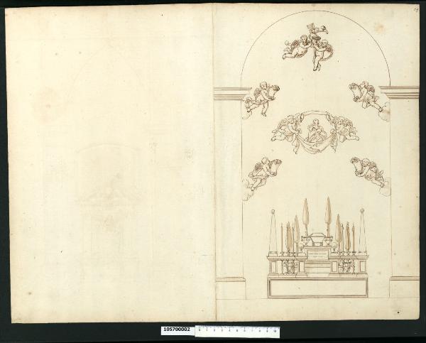 - NOTIZIE STORICO CRITICHE Nell'"Indice" del tomo nel quale era rilegato il disegno viene definito: "Macchina per funerale".\nIl disegno che non è stato possibile identificare mostra il prospetto di una sepoltura inquadrata da un'apertura ad arco. Sopra un alto zoccolo liscio si sviluppa una struttura gradonata che termina con un piedistallo ornato da un'iscrizione, sopra il quale è posizionato il sarcofago fiancheggiato da due vasi. Una balaustra con obelischi e sfere separa il monumento dalla navata. La parete retrostante simula lo spazio aperto del cielo ed è popolata da piccoli geni alati: quelli posti al centro reggono un panneggio che funge da cornice alla raffigurazione della Madonna. alcune soluzioni grafiche ed elementi decorativi tipici del repertorio formale di Giovanni Battista Gisleni, fanno ipotizzare che l'artista ne sia l'autore.