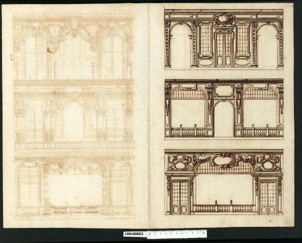 - NOTIZIE STORICO CRITICHE Nell'"Indice" del tomo nel quale era rilegato il disegno viene definito: "Altro come sopra" (leggi: "Addobbo per illuminazione").\nIl presente foglio, così come quello in Milano, Collezione Sardini Martinelli inv. 1,62 r-v, raffigura tre esempi di decorazioni parietali che non è stato possibile identificare. Mossakowski nel suo articolo (1995, rieditato nel 2002) dedicato alla galleria della villa suburbana della regina Maria Lodovica Gonzaga Nevers a Varsavia (Milano, Collezione Sardini Martinelli inv. 1,64), inserisce nell'apparato iconografico anche il disegno inv. 1,61r e lo identifica come un progetto di decorazione per un'alcova. I tre disegni (privi dello stemma coronato, cfr. inv. 1,61r) mostrano la parete suddivisa in tre campate. La prima proposta in alto prevede due aperture laterali ad arco ed una centrale, più ampia, tamponata da serramenti, divise tra loro da lesene rastremate verso il basso. Al centro l'ampiezza delle aperture si inverte, compare una balaustra su cui si impostano lesene decorate da grosse mensole scanalate. L'ultima versione propone la campata centrale ad arco ribassato con balaustra, mentre ai lati sono collocate porte con timpano mistilineo.