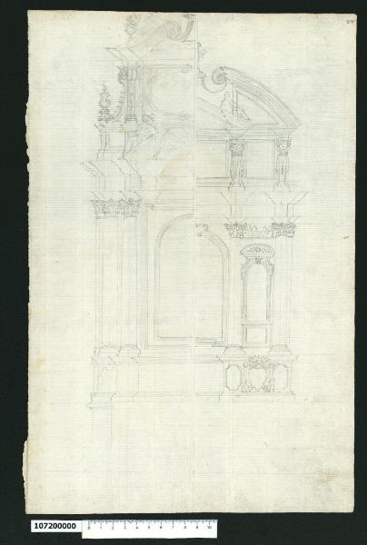 - NOTIZIE STORICO CRITICHE Il disegno che non è stato possibile identificare raffigura due differenti soluzioni per un altare. La soluzione a sinistra mostra un alto podio aggettante su tre differente piani, sul quale si innalza un ordine di colonne corinzie. Le colonne reggono una trabeazione sulla quale, in corrispondenza della pala d'altare centrale, è posto un timpano curvilineo. Al di sopra del timpano si sviluppa un attico ornato da un cartiglio ovale definito lateralmente da volute. Conclude la composizione un altro timpano mistilineo composto da due volute laterali con ricciolo. Questa soluzione è replicata nel foglio Milano, Collezione Sardini Martinelli inv. 1,75 (parte destra del foglio, metà sinistra del disegno) con l'unica variante dell'inserimento di specchiatura e stemma nei piedistalli delle colonne. \nIl disegno a destra mostra il medesimo podio, privo però di sporgenze e ornato con specchiature e stemma, sul quale si impostano colonne corinzie a definire tre campate; nelle laterali sono ricavate delle nicchie, in quella centrale, più ampia è ubicata la pala d'altare. Al di sopra di un'alta trabeazione si imposta un attico anch'esso diviso in tre campate da corte paraste ornate con teste di cherubino. Due spezzoni di timpano curvilineo inquadrano il timpano triangolare posto in corrispondenza della campata centrale.