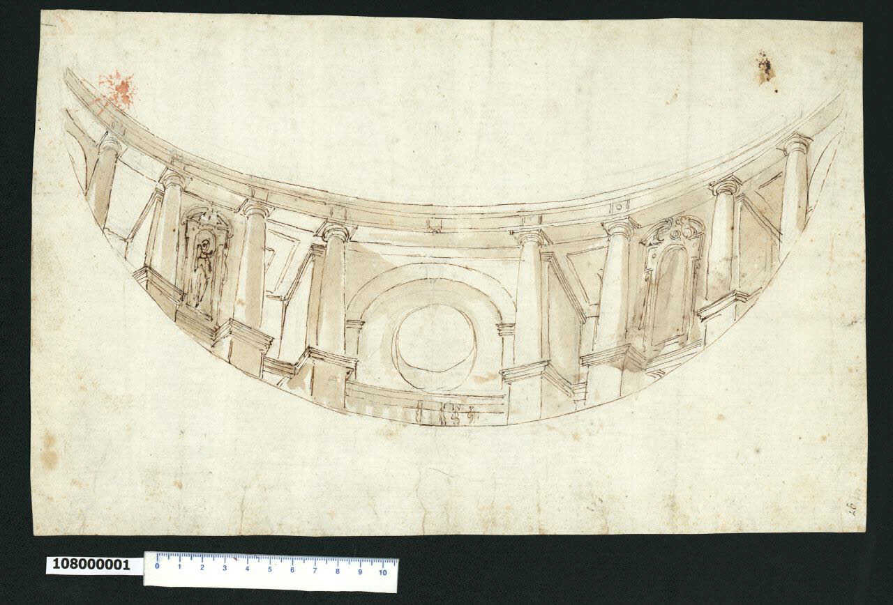 - NOTIZIE STORICO CRITICHE Nell'"Indice" del tomo nel quale era rilegato il disegno viene definito: "Altro d.o" (leggi: "Soffitto").\nIl disegno che non è stato possibile identificare, si riferisce alla decorazione prospettica di una copertura circolare. L'autore suddivide la parete in campate di analoga ampiezza utilizzando colonne di ordine dorico su alto piedistallo. Le campate ospitano alternativamente vani rettangolari dotati di finestre e nicchie ospitanti statue. La campata centrale, più ampia, ha un'apertura ad arco protetta da balaustra che inquadra la parete di fondo entro la quale si apre un oculo. Il disegno costituisce una soluzione semplificata della decorazione raffigurata sul foglio Milano, Collezione Sardini Martinelli inv. 1,79.