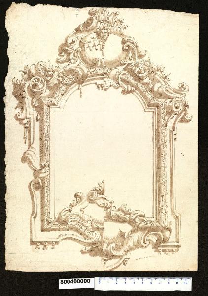 - NOTIZIE STORICO CRITICHE Nell'"Indice" del tomo nel quale il marchese Giacomo Sardini lo aveva rilegato, il disegno viene definito: "Specchio per ornato d'un riquadro". La parte destra del disegno, che offre due proposte diverse per la decorazione dell'incorniciatura di un riquadro, richiama la cornice composta da eleganti motivi fitomorfici che delimita la figura stante di San Vincenzo Ferreri dipinta da Vittorio Maria Bigari, consueto compagno di Stefano Orlandi nell'apparecchiatura di complesse intelaiature ornamentali, nella sesta cappella a destra (già Griffoni, poi Aldrovandi e infine Cospi) in San Petronio a Bologna. L'affresco venne condotto su commissione del Cardinale Pompeo Aldrovandi in un periodo compreso tra il 1725 e il 1729, collocazione cronologica che ben si addice anche al disegno in esame, accostabile per affinità dello stile e del lessico decorativo utilizzato ad altri fogli della Collezione Sardini Martinelli (inv. 8,1; 8,3; 8,6; 8,17; 8,20; 8,37-38 verso), alcuni dei quali proposti all'Orlandi da Elisabetta Landi, col supporto del parere orale di Helmut Lorenz, nel 1981 (Landi 1981, pp. 208-217).