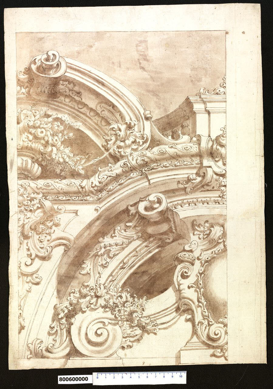 - NOTIZIE STORICO CRITICHE Nell'"Indice" del tomo nel quale il marchese Giacomo Sardini lo aveva rilegato, il disegno viene definito: "Altro come sopra [leggi: Pieritto per dipingersi]". Il foglio sembrerebbe presentare una proposta per la decorazione ad affresco del punto di raccordo tra parete e soffitto. Alcune porzioni del disegno, dal ritmo accentuatamente mosso e articolato, corrispondono fedelmente all'intelaiatura architettonica dipinta da Stefano Orlandi nella sala delle Stelle in palazzo Manfredi a Faenza (Ravenna) tra il 1727 e il '28 insieme a Vittorio Maria Bigari, suo consueto collaboratore nelle vesti di figurista, che vi rappresentò il Carro della Notte. Nel Settecento, infatti, il palazzo subisce una serie di modifiche per adeguarlo alla nuova funzione di residenza dei governatori pontifici, comprendenti l'affrescatura dell'appartamento del Magistrato condotta dai due affiatati colleghi. Le affinità tra la versione grafica e quella ad affresco riguardano soprattutto il timpano spezzato culminante in un motivo a spirale e incorniciante un vaso baccellato colmo di frutta e fiori, come pure il timpano spezzato sottostante decorato da esuberanti elementi fogliacei resi con un tratto sicuro e nervoso. Tanto lo stile che la selezione del repertorio ornamentale avvicinano questo elegante disegno ad altri appartenenti alla stessa Collezione Sardini Martinelli (inv. 8,1; 8,4; 8,5; 8,20 recto; 8,3; 8,37-38 verso), parimente efficaci nella resa degli effetti plastici e tridimensionali grazie alla sapiente distribuzione del chiaroscuro, alcuni dei quali nel 1981 sono stati proposti all' Orlandi da Elisabetta Landi (Landi 1981, pp. 208-217). Non sappiamo se questo nucleo di disegni sia stato acquisito dal Sardini con la corretta paternità del bolognese, che entro il 1739 aveva lavorato a Lucca col concittadino Gioseffo Orsoni nel campo della scenografia teatrale (G.P. Zanotti, Storia dell'Accademia Clementina, Bologna 1739, II, pp. 254 e 260). In assenza di più precise notizie documentarie non possiamo escludere che queste prove grafiche siano state lasciate dallo stesso Orlandi nelle mani di qualche appassionato collezionista residente nella città toscana e da lì passate nella raccolta del marchese Sardini.