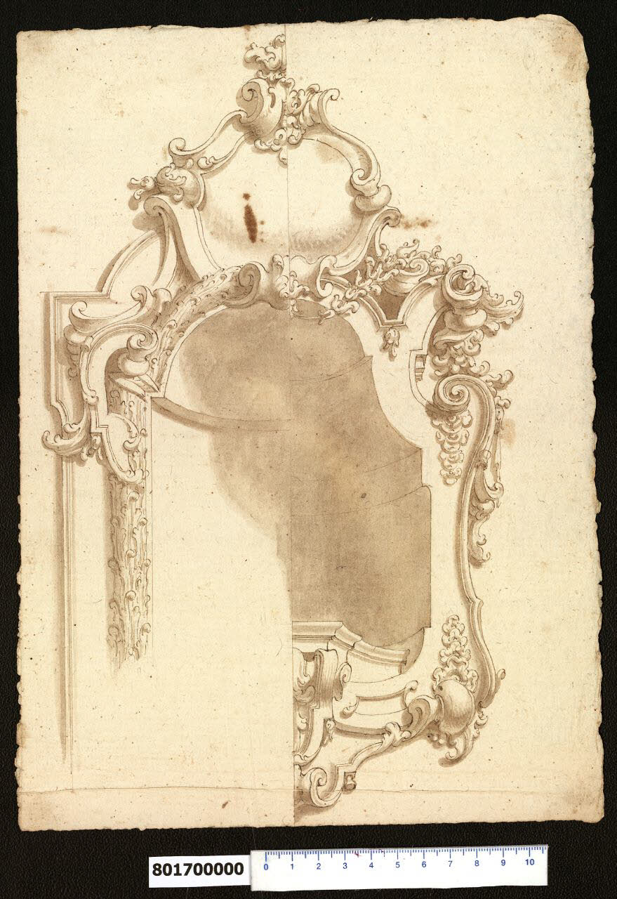 - NOTIZIE STORICO CRITICHE Nell'"Indice" del tomo nel quale il marchese Giacomo Sardini lo aveva rilegato, il disegno viene definito: "Nicchia ornata in due maniere". Si tratta effettivamente, come suggerito dal Sardini, di due proposte alternative per un cornicione da tradurre in pittura per delimitare una nicchia, che forse avrebbe dovuto illusivamente ospitare una statua da poggiarsi sulla mensola collocata al suo interno. Se la porzione sinistra appare di gusto più tradizionale, di una solidità di ascendenza ancora barocca, quella destra - nell'esuberanza ornamentale dei motivi fogliacei dai bordi nervosamente frastagliati e nel gioco delle volute - rivela un'inclinazione di indirizzo già rocaille. Nel 1981 Elisabetta Landi ha reso noto un disegno già in Collezione Certani a Bologna e ora a Venezia presso la Fondazione Giorgio Cini (inv. 33022) con un'attribuzione a scuola di Stefano Orlandi, mettendolo in relazione con quello in esame, del quale la fedele ma appena più rigida versione veneziana potrebbe costituire una replica ascrivibile allo stretto entourage del maestro. Il disegno è avvicinabile per la scelta di un simile repertorio decorativo, riscontrabile nella produzione pittorica dell'Orlandi, per la scioltezza del tratto e per la tecnica utilizzata ad altri fogli appartenenti alla Collezione Sardini Martinelli (nn. inv. 8,1; 8,20 recto; 8,3; 8,5; 8,6; 8,37-38 verso; 8,4; 8,24 recto e 8,32).