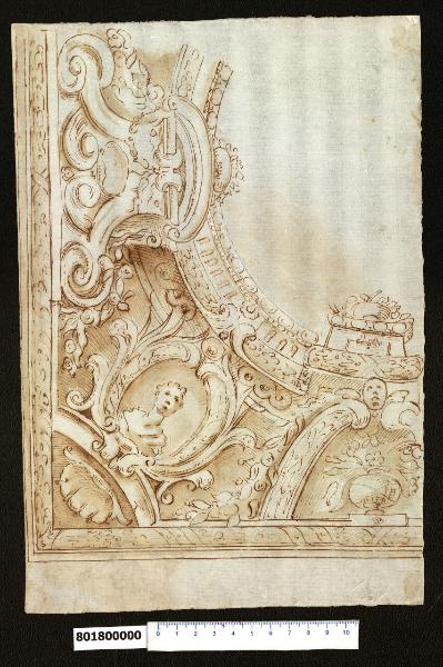 - NOTIZIE STORICO CRITICHE Nell'"Indice" del tomo nel quale il marchese Giacomo Sardini lo aveva rilegato, il disegno viene definito: "Disegno di soffitto". Il foglio riporta il progetto, corrispondente ad una fase piuttosto avanzata, ma non ancora definitiva, dell'eleborazione progettuale per la decorazione ad affresco della volta della sala dell'Aurora ubicata al terreno del palazzo Controni in via dell'Angelo Custode a Lucca. Il ciclo ornamentale, che si estende anche al piano nobile dell'edificio, è stato reso noto da Paola Betti che lo ha assegnato per la parte quadraturistica al lucchese Ippolito Marracci e per l'esecuzione delle figure a Giovanni, fratello di questi, e a Domenico Brugieri che gli subentrò con lo stesso incarico dopo la morte avvenuta nel 1703 (Betti 2007, pp. 101-106). Il palazzo, già di proprietà dela famiglia Guinigi, era stato acquistato nel 1686 da Giovanni di Curzio Controni, che in seguito provvide a commissionarne l'affrescatura. Secondo diverse soluzioni compositive che, nell'impaginazione e nella scelta del repertorio ornamentale, risentono dell'influenza di Angelo Michele Colonna, presso il quale verosimilmente si era svolta la formazione quadraturistica di Ippolito, questi concepì gli schemi architettonici che accolgono le figure dipinte dal fratello Giovanni, poste al centro dei soffitti (tra gli altri soggetti si ricordano l'Allegoria della Temperanza, Apollo, La Pace che appicca il fuoco alle armi) e distribuite su vari piani all'interno delle intelaiature prospettiche, caratterizzate da un deciso vigore plastico e chiaroscurale. A quell'epoca il Marracci doveva certo conoscere anche il ciclo ornamentale lasciato in palazzo Mansi a Lucca dal bolognese Marc'Antonio Chiarini, in compagnia del concittadino Giovan Gioseffo Dal Sole e del fiorentino Giovanni Maria Ciocchi, sul finire degli anni ottanta del Seicento. Con la sala del Fuoco di palazzo Mansi (G. Borella, P. Giusti Maccari, Il Palazzo Mansi di Lucca, Lucca 1993, figg. a p. 84), infatti, la sala dell'Aurora condivide l'uso della cornice circolare per delimitare l'apertura sul cielo - con ovoli, scanalature, foglie di quercia e motivi a treccia - la nicchia ogivale su due lati della volta e, nelle zone angolari, i busti all'antica inseriti entro medaglioni da cui si dipartono festoni di frutta che corrono lungo il perimetro del soffitto. Rispetto alla versione pittorica, il disegno in esame, realizzato con tocco leggero e fluido, mostra alcune varianti: ad esempio nel foglio non sono previste né le due cornucopie che poi verranno dipinte a imitazione del bronzo alla base dei medaglioni posti negli angoli della volta né l'ovale contenente la colomba con il ramo d'olivo affrescata su due lati del soffitto.