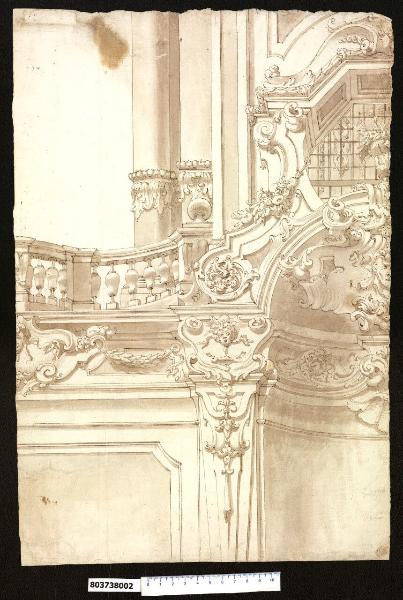 - NOTIZIE STORICO CRITICHE Nell'"Indice" del tomo nel quale il marchese Giacomo Sardini lo aveva rilegato, il disegno viene definito: "38. Pie ritto per una volta". In realtà sembra trattarsi dello studio per una articolata intelaiatura architettonica destinata a essere tradotta ad affresco sulla parete di una sala, anche se per il momento non è possibile collegarlo a un'opera specifica. Come suggerito da Elisabetta Landi, supportata dal parere orale di Helmut Lorenz, nell'intervento dedicato al bolognese Stefano Orlandi in occasione del terzo centenario della sua nascita, il disegno è riferibile al pittore insieme ad altri ugualmente appartenenti alla Collezione Sardini Martinelli (inv. 8,1; 8,5; 8,14 recto; 8,17; 8,20 recto: Landi 1981, pp. 208-217, in particolare pp. 213 e 216, nota 18). Convincenti risultano soprattutto i confronti con lo studio per l'ornato del punto di raccordo tra parete e soffitto (inv. 8,6), che non figura tra quelli assegnati dalla Landi al bolognese, con il disegno preparatorio per la zona angolare di una volta (inv. 8,20 recto) e con il foglio recante una "mensola ornata" (inv. 8,1), per la sovrabbondanza dei motivi decorativi corrispondenti al tipico formulario dell'Orlandi - mascheroni, spirali, frutta, balaustrini - che si sovrappongono gli uni agli altri creando talvolta una sensazione di horror vacui. Allo stesso modo in tutti i fogli citati si rileva una notevole capacità di creare convincenti effetti plastici e tridimensionali grazie ala resa oculata dei passaggi chiaroscurali. Se il gruppo di disegni sopra ricordati fosse già stato accompagnato dal riferimento all'Orlandi al momento dell'acquisto da parte del Sardini, esso avrebbe certo assunto un interesse supplementare per il collezionista, dato che il bolognese aveva lavorato a Lucca nella realizzazione di effimeri apparati d'occasione e di scenografie teatrali insieme al concittadino Gioseffo Orsoni, forse negli anni '20 del Settecento (G.P. Zanotti, Storia dell'Accademia Clementina, Bologna 1739, II, pp. 254 e 260).