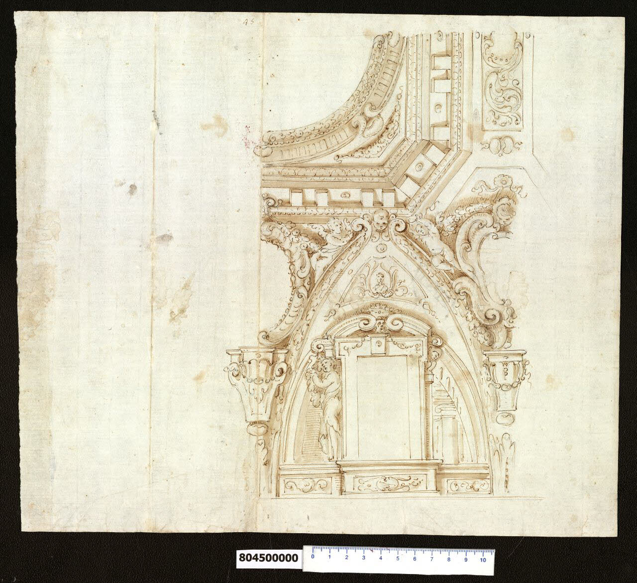 - NOTIZIE STORICO CRITICHE Nell'"Indice" del tomo nel quale il marchese Giacomo Sardini lo aveva rilegato, il disegno viene definito: "Parte di altro soffitto". Il foglio sembra costituire una copia semplificata - sfrondata da alcuni elementi architettonici e decorativi, in parte scomposti e rimischiati all'interno dell'intelaiatura compositiva - della volta della chiesa bolognese di San Bartolomeo affrescata tra il 1665 e il '66 da Angelo Michele Colonna insieme a Giacomo Alboresi, al quale si era associato in seguito alla scomparsa di Agostino Mitelli, suo affiatato collaboratore, avvenuta nel 1660. La poderosa compagine prospettica messa a punto intorno allo sfondato, dove il Colonna ha raffigurato la Visione di San Gaetano, ne testimonia la fedeltà agli insegnamenti di Girolamo Curti con l'alternanza di pennacchi e balaustre rivestiti da un ornato sontuoso, aderendo alla reale conformazione architettonica dell'edificio, come in seguito faranno Enrico Haffner nelle quadrature dei Santi Domenico e Sisto a Roma (1675) e, per venire all'ambito lucchese da cui proviene il disegno in esame, Pietro Paolo Scorsini in Santa Maria Corteorlandini (1715-1720 ca) e Ippolito Marracci nella chiesa della certosa di Farneta (post 1693). E' proprio a quest'ultimo che, almeno ipoteticamente, è riconducibile questa sorta di esercizio grafico, che ben si inserirebbe nell'iter formativo del giovane pittore avviato alla professione di quadraturista proprio dal grande bolognese, attivo a Lucca tra il 1677 e il '78 nella villa Arnolfini a Gragnano e in Santa Maria Corteorlandini. Il fatto che gli zii paterni di Ippolito e due suoi fratelli vestissero l'abito dei Chierici Regolari della Madre di Dio, titolari di quella chiesa, dovette certo facilitare il consenso del Colonna ad accogliere e condurre presso di sé a Bologna l'aspirante quadraturista. Anche se al momento mancano precise testimonianze documentarie in tal senso, il soggiorno bolognese di Ippolito, oltre che da Pellegrino Antonio Orlandi (P.A. Orlandi, Abecedario pittorico, Bologna 1704, p. 198), è indicato con insistenza dalle fonti storico artistiche lucchesi ed è convalidato dai dati stilistici emergenti dalle sue opere. Dovette trattarsi di un'esperienza decisiva per lo studio delle regole della prospettiva e l'osservazione dei capitali esempi di decorazione quadraturistica esistenti nel capoluogo emiliano. Non c'è da stupirsi quindi se il lucchese si sia esercitato anche sugli affreschi di San Bartolomeo, dai quali si suppone abbia tratto una libera derivazione grafica, e della cui conoscenza dovette far tesoro al momento di intraprendere l'ornamentazione della chiesa della certosa di Farneta insieme a Stefano Cassiani nel ruolo di figurista (Betti 2007, pp. 87-137). Anche se qui si registra una maggiore minuzia del segno, il foglio può essere confrontato con i numeri inv. 8,2; 8,15; 8,18; 8,44 della Collezione Sardini Martinelli, parimente riferibili al Marracci.