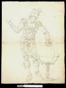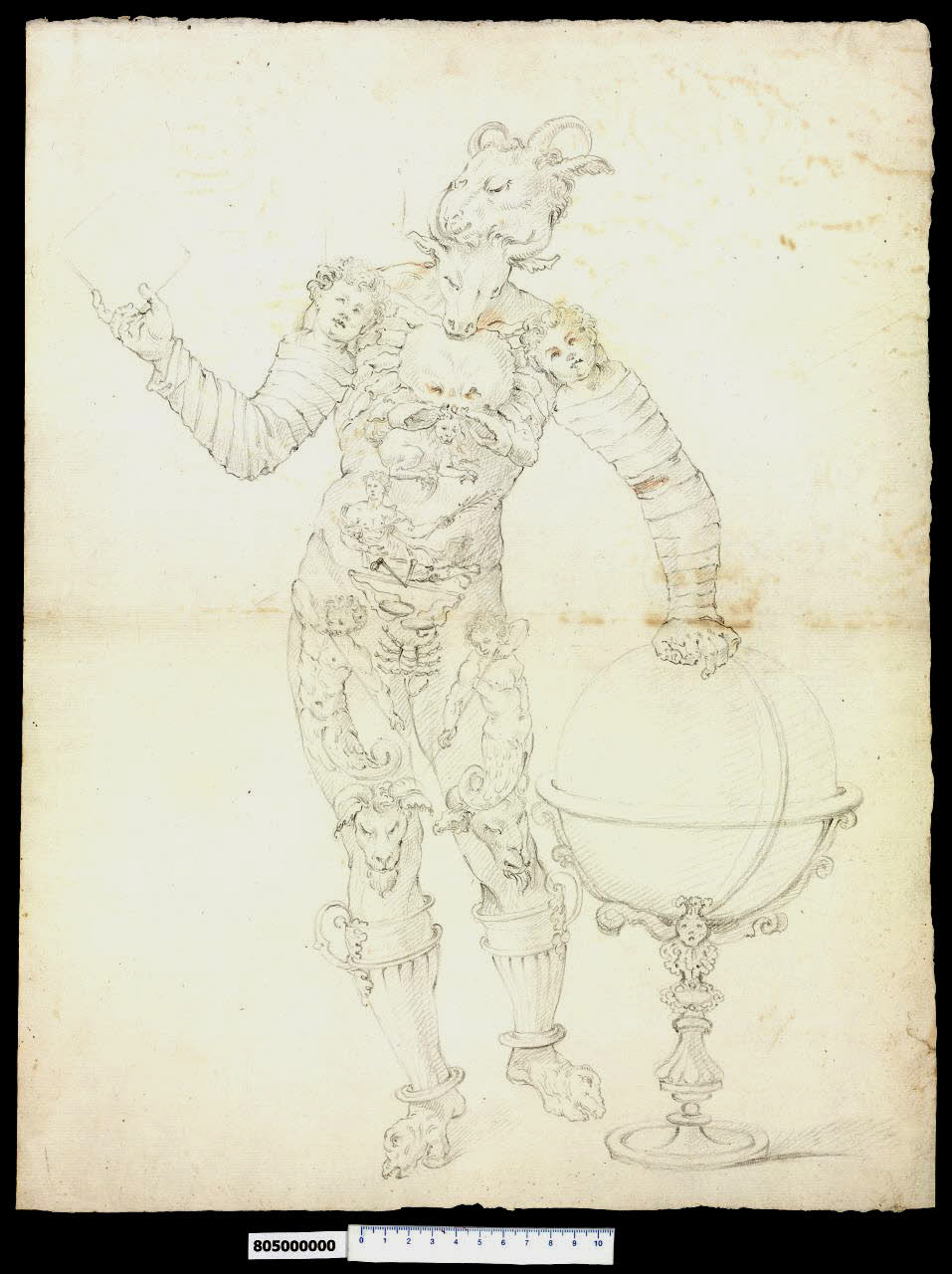 - NOTIZIE STORICO CRITICHE Nell'"Indice" del tomo nel quale era rilegato il disegno viene definito: "Idolo emblematico". \nIl disegno in esame rappresenta una figura umana, le cui parti del corpo corrispondono ai diversi segni zodiacali, che con la mano destra tiene un foglio, mentre la mano sinistra è appoggiata sul globo di un mappamondo. \nImmagini astrologiche, cosmologiche e a contenuto magico-esoterico e allegorico-simbolico furono parte integrante della cultura, dell'universo mentale e della stessa produzione di quasi tutti i maggiori artisti del Cinquecento.\nIl disegno potrebbe semplicemente rappresentare il potere divinatorio astrologico che domina il mondo oppure avere collegamenti con la mitologia e rappresentare l'immagine di Eracle (Ercole) come dominatore del mondo, le cui dodici fatiche furono correlate con i segni dello Zodiaco, molti dei quali sono rappresentati da animali.