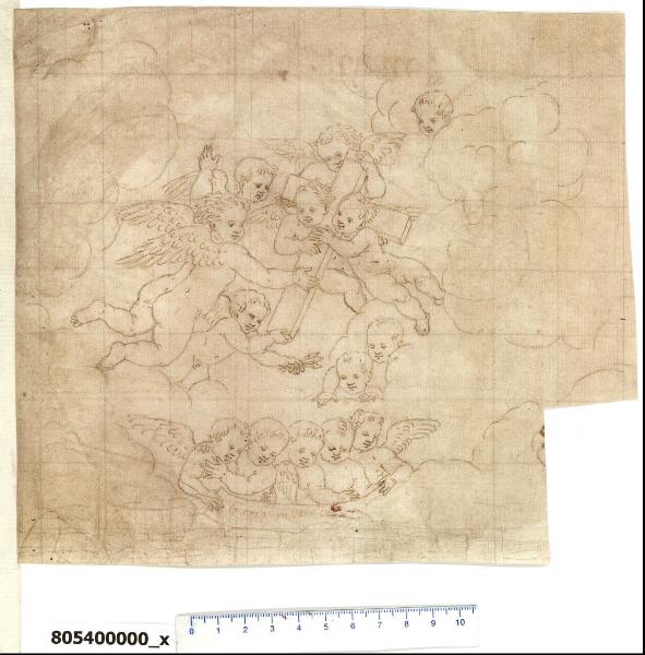 - NOTIZIE STORICO CRITICHE Nell'"Indice" del tomo nel quale il marchese Giacomo Sardini lo aveva rilegato, il disegno viene definito: "Ornati del med.° [leggi: Giovanni da Udine]". Il foglio è strettamente connesso al n. inv. 8,54 verticale1, al centro del quale è stato arbitrariamente sistemato praticando un'apertura circolare nel disegno, un montaggio forse risalente all'epoca dell'acquisizione da parte del collezionisa lucchese. Se il foglio che lo incornicia, ornato con una trama di esili arabeschi, appare databile per ragioni stilistiche allo scorcio del Settecento, per quello in esame - che presenta una quadrettatura tracciata, come di consueto, per agevolare il processo di trasposizione pittorica indicando di appartenere a una fase già molto avanzata dell'elaborazione progettuale - sembra più appropriata una collocazione cronologica sul finire del Cinquecento. Tale proposta è supportata dalla tipologia fisionomica degli angeli, resi con un segno incisivo e non particolarmente fluido, come dai caratteri grafici con cui è stata redatta l'iscrizione "Gloria in ecelsis" sul cartiglio retto dai putti, che sembrano affacciarsi da un balcone di nubi guardando verso il basso. Risale verosimilmente al 1794 il viaggio compiuto dal marchese Sardini a Firenze, Bologna, Modena e Parma, di cui rimane un breve resoconto manoscritto nell'Archivio di Stato di Lucca (Sardini 48, I fascicolo), di recente pubblicato integralmente, durante il quale il collezionista non mancò di effettuare alcuni acquisti di disegni per accrescere la propria raccolta. Dal taccuino di viaggio si apprende che in data 26 luglio il Sardini acquista a Bologna "quattro disegni di Paolo Dardani e una testa di Donato Creti, ed un disegno di putti" (S. Caccia, E. Pellegrini, Nobile viaggiare. Luoghi, uomini e cose nel taccuino di Giacomo Sardini, Edizioni ETS, Pisa 2008, p. 33). Per quest'ultimo si può proporre, seppure tentativamente, un'identificazione con il foglio in esame.