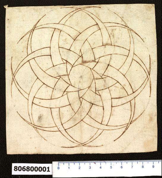 - NOTIZIE STORICO CRITICHE Nell'"Indice" del tomo nel quale era rilegato il disegno viene raggruppato con altri sotto il titolo: "Corpi disegnati con figure geometriche".\nLa composizione disegnata sul foglio è un decoro geometrico realizzato tracciando una successione di cerchi e rappresenta dei nastri intrecciati a partire da un nucleo ottagonale, quasi a formare un canestro. Potrebbe trattarsi del decoro per una pavimentazione. Non è stato possibile individuare l'autore del disegno.