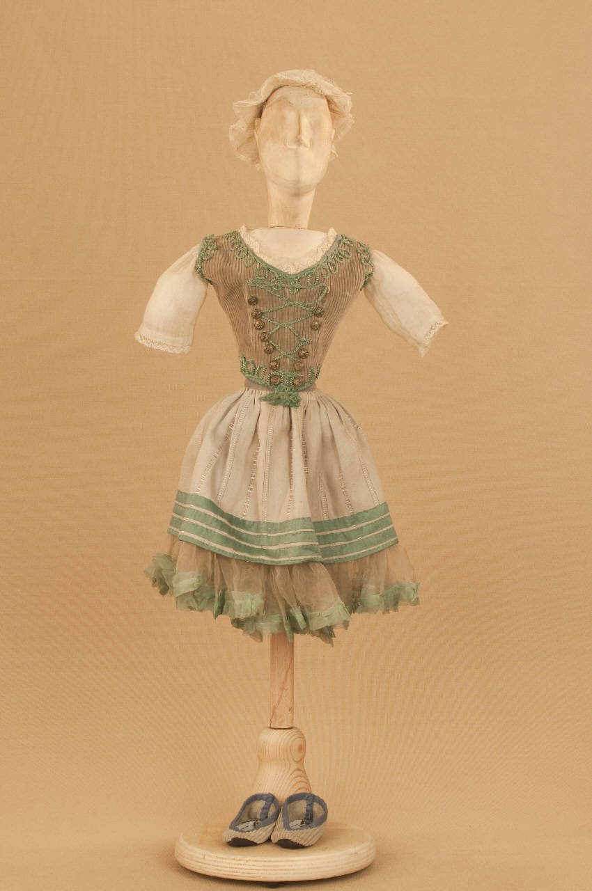 - NOTIZIE STORICO CRITICHE "Le scarpe sono state realizzate da Eugenio Monti Colla nel 1977. Costume realizzato per Il ballo "Excelsior", spettacolo che fu rappresentato la prima volta a Milano, al Teatro alla Scala, la sera dell'11 gennaio 1881. Autore del libretto e della coreografia era Luigi Manzotti, mentre Romualdo Marengo lo era della musica e Alfredo Edel delle scene e dei costumi. Il successo del ballo fu travolgente. Le repliche furono 103 nel 1881.\nLa versione marionettistica per la Compagnia Carlo Colla e Figli in due tempi e undici quadri fu allestita da Carlo II Colla col consenso dell'autore e presentata col titolo di "Civiltà e Progresso" nel 1895. Il titolo mutò poi nel tempo. Il primo allestimento del ballo ricordava ancora troppo l'originale scaligero. Ma fu sufficiente che lo spettacolo entrasse nella routine degli spostamenti della Compagnia perché le peculiarità del teatro marionettistico diventassero preponderanti.\nCosì l'"Excelsior" approdò al Teatro Gerolamo di Milano, quando la Compagnia ci entrò stabilmente nel 1906, proprio negli anni in cui, dopo qualche ultima apparizione, il "ballo grande" italiano, simbolico-narrativo sta tramontando sulle scene europee, divenendo unico retaggio del teatro delle marionette e, più particolarmente, della Compagnia Carlo Colla e Figli che ha continuato a riproporlo sino ad oggi, offrendo al pubblico di un secolo dopo la più vivida testimonianza del kolossal scaligero. Da nota scritta a matita sul "Giro Piazze della Compagnia Carlo Colla e Figli 1883-1912" si evince che la prima rappresentazione del ballo "Excelsior" è stata fatta a Caluso (TO) nel 1895."