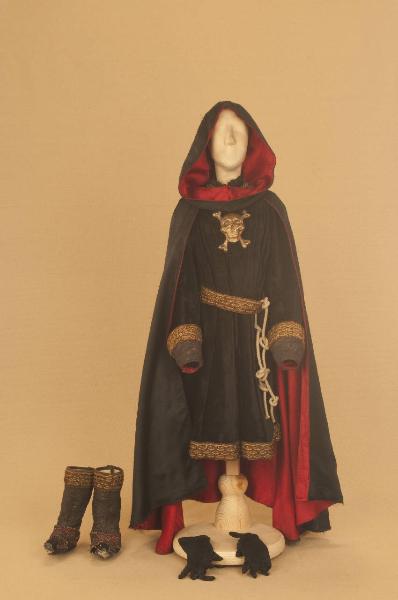 Costume fantastico da uomo composto da veste, mantello, paramani, guanti, cintura e calzari.