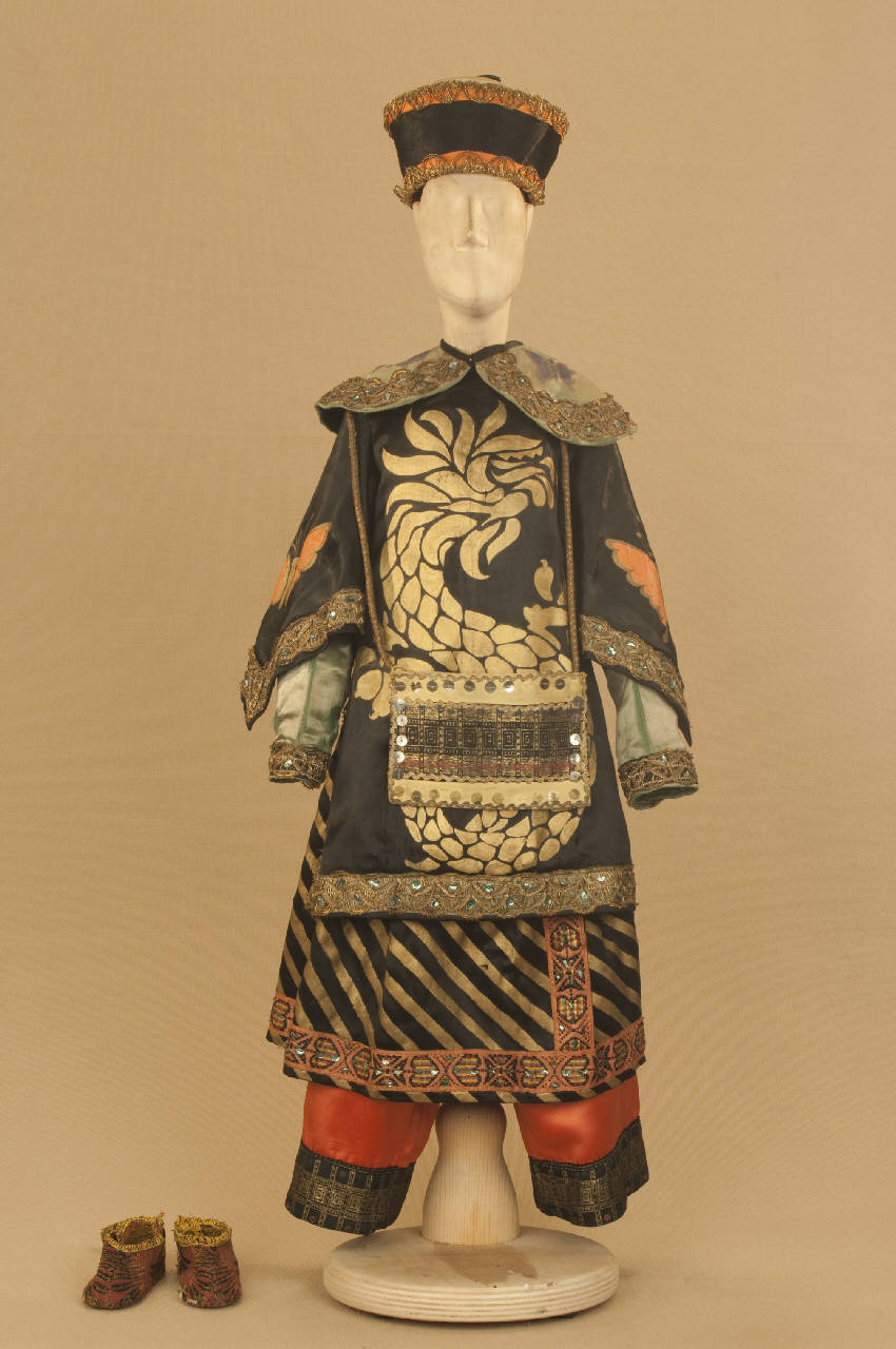 Costume folcloristico da uomo cinese composto da pantaloni, gonna, veste, pettorale, collo, cappello e scarpe.