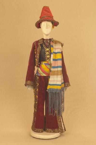 Costume folcloristico da uomo messicano composto da pantaloni, corta giubba, gilet, cravatta, fascia, sciarpa, fazzoletto da testa e cappello.