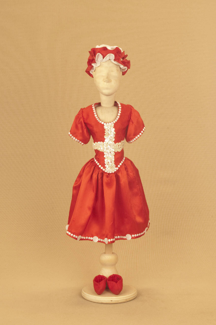 - NOTIZIE STORICO CRITICHE Costume realizzato nel 1999 per il riallestimento, al Piccolo Teatro di Milano, del ballo "Excelsior", spettacolo che fu rappresentato la prima volta a Milano, al Teatro alla Scala, la sera dell'11 gennaio 1881. Autore del libretto e della coreografia è Luigi Manzotti, mentre Romualdo Marengo lo è della musica e Alfredo Edel delle scene e dei costumi.\nIl successo del ballo fu travolgente. Le repliche furono 103 nella stagione.\nLa versione marionettistica per la Compagnia Carlo Colla e Figli in due tempi e undici quadri fu allestita da Carlo II Colla col consenso dell'autore e presentata col titolo di "Civiltà e Progresso" nel 1895. Il titolo mutò poi nel tempo. Il primo allestimento del ballo ricordava ancora troppo l'originale scaligero. Ma fu sufficiente che lo spettacolo entrasse nella routine degli spostamenti della Compagnia perché le peculiarità del teatro marionettistico diventassero preponderanti.\nCosì l'"Excelsior" approdò al Teatro Gerolamo di Milano, quando la Compagnia ci entrò stabilmente nel 1906, proprio negli anni in cui, dopo qualche ultima apparizione, il "ballo grande" italiano, simbolico-narrativo sta tramontando sulle scene europee, divenendo unico retaggio del teatro delle marionette e, più particolarmente, della Compagnia Carlo Colla e Figli che ha continuato a riproporlo sino ad oggi, offrendo al pubblico di un secolo dopo la più vivida testimonianza del kolossal scaligero. Da nota scritta a matita sul "Giro Piazze della Compagnia Carlo Colla e Figli 1883-1912" si evince che la prima rappresentazione del ballo "Excelsior" è stata fatta a Caluso (TO) nel 1895.