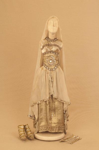 Costume allegorico da donna composto da gonna, corpino, alta cintura, bracciali, velo e calzari.