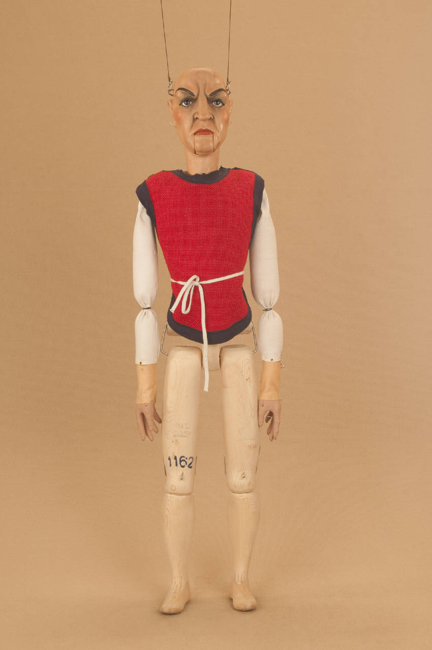 Testa di legno di tiglio fissata al corpo tramite ferro, occhi di vetro, bocca mobile. Corpo grande in abete snodato in vita ad incastro, gambe unite al bacino tramite bordione in ferro, ginocchia ad incastro, mani mobili al polso con dita scolpite e separate, bilancino originale metodo Holden.