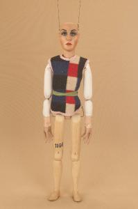 Testa di legno di tiglio fissata al corpo tramite ferro, occhi di vetro, bocca mobile. Corpo normale in abete snodato in vita ad incastro. Gambe unite al bacino tramite bordione in ferro, ginocchia ad incastro. Mani in tiglio con dita scolpite e separate. Piedi piombati. Bilancino a croce metodo Holden.