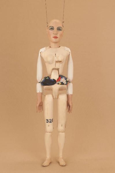 Testa di legno di tiglio fissata al corpo tramite ferro, occhi di vetro. Corpo normale in abete snodato in vita ad incastro. Gambe unite al bacino tramite bordione in ferro, ginocchia ad incastro. Mani in tiglio con dita scolpite e separate. Piedi piombati. Bilancino a croce metodo Holden.