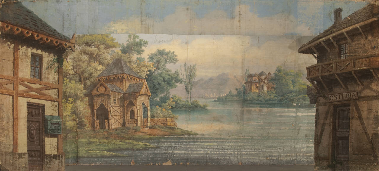Scenografia in carta, fortezzata con strisce di tessuto di cotone, dipinta ad acqua e composta da un fondale e un principale.
