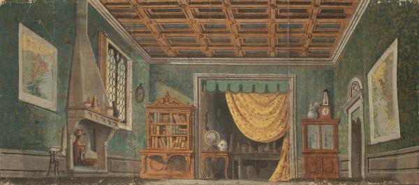 Scenografia in carta, fortezzata con strisce di tessuto di cotone, dipinta ad acqua e composta da un solo fondale.