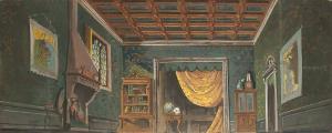 - NOTIZIE STORICO CRITICHE Scenografia realizzata, riprendendo fedelmente la composizione ed i cromatismi dell'antica scena (C 01432) dipinta da Leone Mens nel 1895. La scenografia fu pensata per il "Ballo Excelsior", spettacolo che fu rappresentato la prima volta a Milano, al Teatro alla Scala, la sera dell'11 gennaio 1881. Autore del libretto e della coreografia era Luigi Manzotti, mentre Romualdo Marengo lo era della musica e Alfredo Edel delle scene e dei costumi. I cromatismi ripetono l'impostazione mesta ed il segno delle pennellate tipiche di L. Mens che erano stati in seguito ripresi dalla "mano" di Lualdi. Nonostante ciò, e fortemente riconoscibile la "mano" di R. Di Lauro caratterizzata dalla pennellata e dal segno marcato e scolastico.\nIl successo del ballo fu travolgente. Le repliche furono 103 nella stagione.\nLa versione marionettistica per la Compagnia Carlo Colla e Figli in due tempi e undici quadri fu allestita da Carlo II Colla col consenso dell'autore e presentata col titolo di "Civiltà e Progresso" nel 1895. Il titolo mutò poi nel tempo. Il primo allestimento del ballo ricordava ancora troppo l'originale scaligero. Ma fu sufficiente che lo spettacolo entrasse nella routine degli spostamenti della Compagnia perché le peculiarità del teatro marionettistico diventassero preponderanti.\nCosì l'"Excelsior" approdò al Teatro Gerolamo di Milano, quando la Compagnia ci entrò stabilmente nel 1906, proprio negli anni in cui, dopo qualche ultima apparizione, il "ballo grande" italiano, simbolico-narrativo sta tramontando sulle scene europee, divenendo unico retaggio del teatro delle marionette e, più particolarmente, della Compagnia Carlo Colla e Figli che ha continuato a riproporlo sino ad oggi, offrendo al pubblico di un secolo dopo la più vivida testimonianza del kolossal scaligero. Da nota scritta a matita sul "Giro Piazze della Compagnia Carlo Colla e Figli 1883-1912" si evince che la prima rappresentazione del ballo "Excelsior" è stata fatta a Caluso (TO) nel 1895.