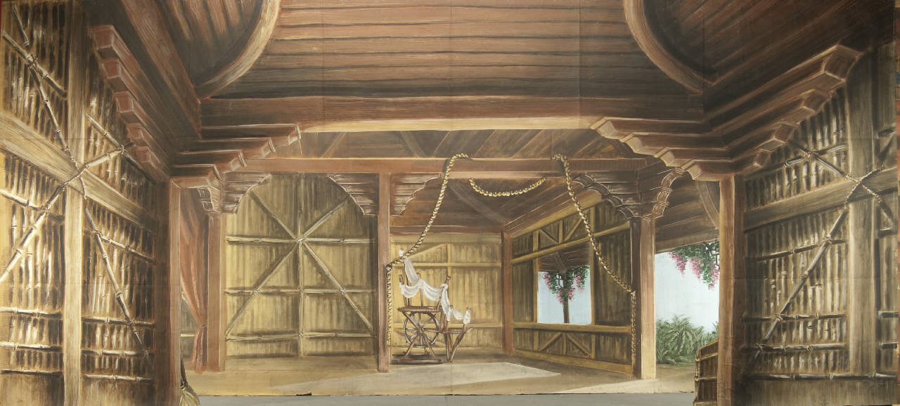 Scenografia in carta dipinta ad acqua e fortezzata ai bordi perimetrali , composta da un fondale e un principale.