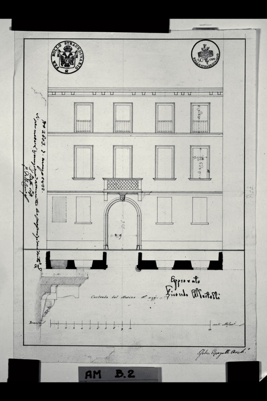 Pianta e prospetto della fronte di Casa Varesi a Milano (già Contrada del Marino 1139) con sezione della modanatura del portone. Pianta e prospetto della fronte di Casa Varesi a Milano (già Contrada del Marino 1139) con sezione della modanatura del portone