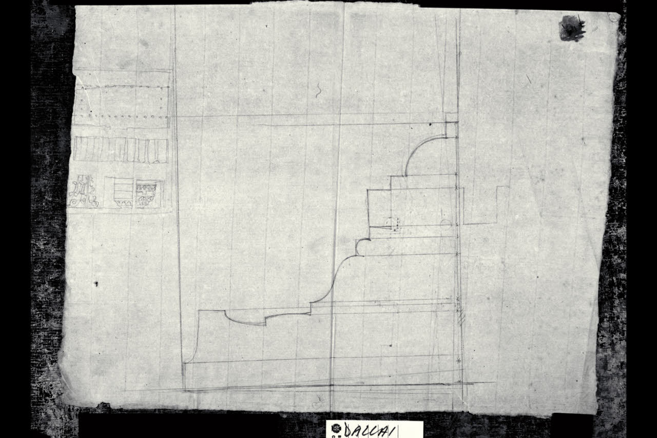 Pianta del colonnato di S. Lorenzo a Milano con prospetti di elementi decorativi e sezione di modanatura. Pianta del colonnato di S. Lorenzo a Milano con prospetti di elementi decorativi e sezione di modanatura